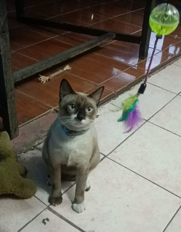 รอยตำหนิ: ใส่ปลอกคอสีฟ้า ตาสีฟ้า อุ้งเท้าเป็นสีขาวเหมือนใส่ถุงเท้า3ข้าง มีเท้าหน้าขวาที่เป็นสีดำข้างเดียว หางขอดซน ขี้อ้อนแต่ชอบงับนิ้ว