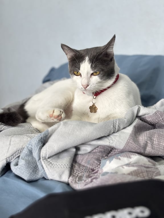 รอยตำหนิ: แมวลายวัว มีจุดดำบนลำตัว 3 จุดใหญ่ หางสีดำ มีไฝที่ปากแมวลายวัว ตาสีเหลือง ตอนหายใส่ปลอกคอสีแดง มีจี้รูปดอกไม้สีแดงเหลือง