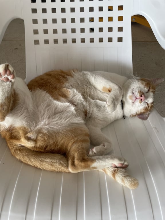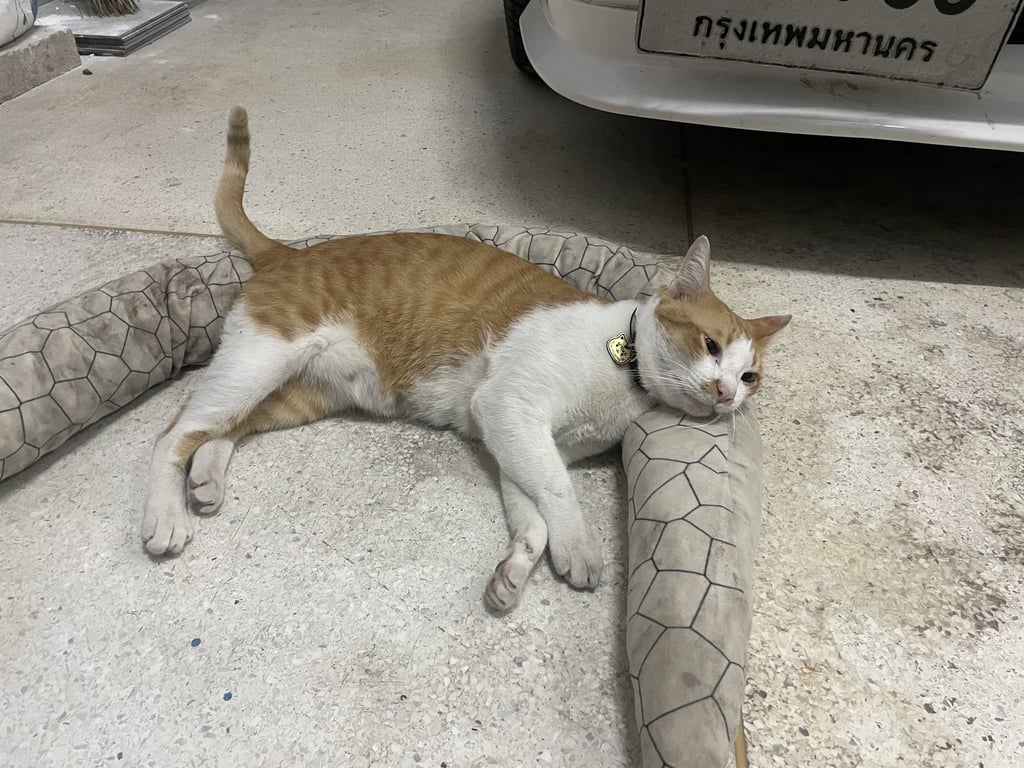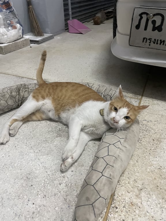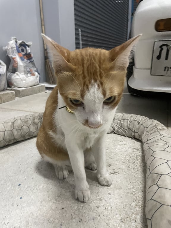 รอยตำหนิ: มีแผลบริเวณหลังหูแมวสีส้มขาว ไม่มีปลอกคอ ตัวอ้วน หายบริเวณหน้าศาลเจ้าพ่อเขาใหญ่