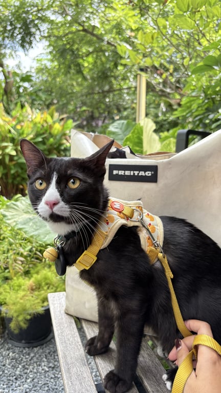 รอยตำหนิ: หน้ารูปหัวใจคว่ำสีขาว คางขาว ใส่ถุงขาข้อสั้นที่ขาหลัง ปลายทางกระดูกจะงอๆ มีแผลเป็นที่โคนหาง ลายสลิดดำเทาเข้ม ตาสีเหลืองเข้ม ปลอกคอสีฟ้าสะท้อนแสง กระดิ่งสีเหลือง-ฟ้า ขี้อ้อนไม่กลัวคนอุ้มได้ ไม่กลัวคน ขี้อ้อน ทำหน้ามึนๆ แต่ฟังรู้เรื่อง