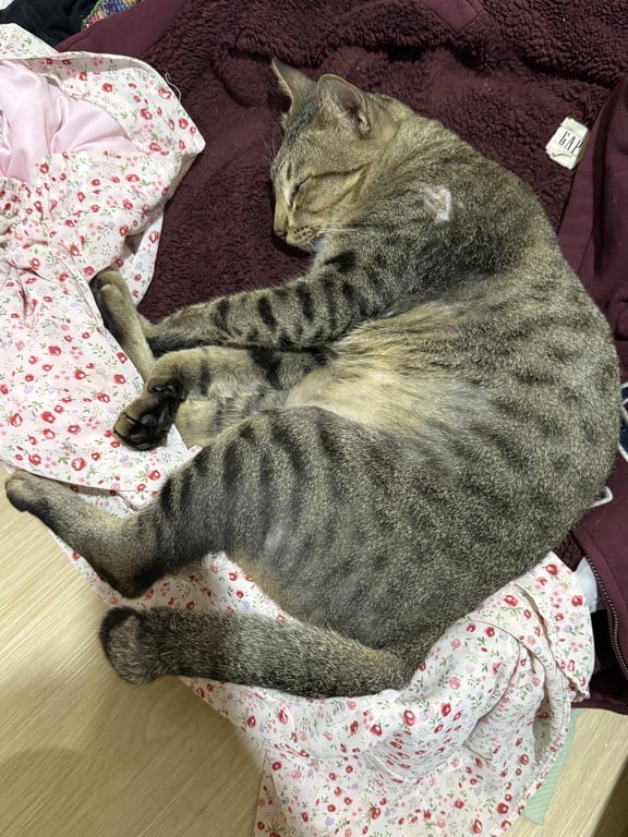 รอยตำหนิ: มีรอยแผลเป็น ปลายหางงอเป็นรูปสายฟ้านิสัยกลัวคนแปลกหน้า ถ้าเจอคนแปลกหน้าาจะชอบหลบ เอาขนมแมววเลียล่อจะเข้าหาได้ แมววที่ไม่คุ้นเคยจะขู่ อยู่ร่วมกับแมวตัวอื่นไม่ได้ ตัวค่อนข้างสูง ไม่อ้วน ตัวใหญ่ ถ้าได้ยินเสียงสตาร์ทรถจะวิ่งออก