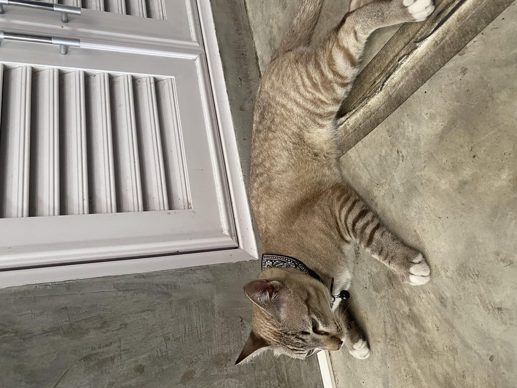 รอยตำหนิ: น้องใส่ปลอกคอมีกระดิ่งเเบบผ้าพันคอสีดำ น้องหางตรง ขี้เล่น เเละเป็นมิตรกับผู้คน