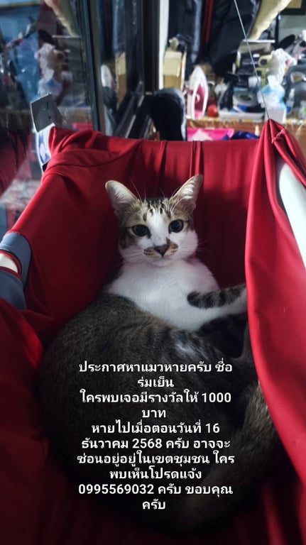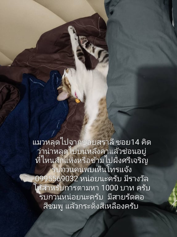 รอยตำหนิ: ขี้อ้อนอยู่หมู่บ้านสราลี ซ.14 เทพารักษ์64 ชอบเล่นกับคน นิสัยดี ก่อนหายไปใส่กระดิกสีเหลือง ปลอกคอชมพู ดูแข็งแรง ดูแล้วน่าเอ็นดู คิดว่าน่าแอบในพุ่มไม้ หรือในชุมชน แถวๆ ซอยชวาล ซอยศรีเจริญ หรือ ไปไกลกว่า รบกวนคนพบเจอช่วยติดต่อ 0995569032 นะครับ มีร◌างวัลให้ 1000 บาท