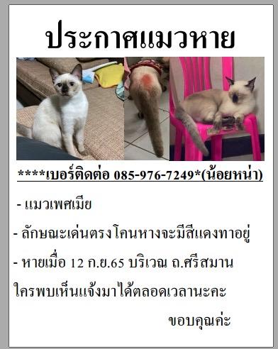 รอยตำหนิ: หางตรง มีแต้มแดงตรงโคนหางโดนยาย้อมผมหายออกจากซอยข้าวหมกไก่ตรงข้ามซอยสวมเด็จย่า