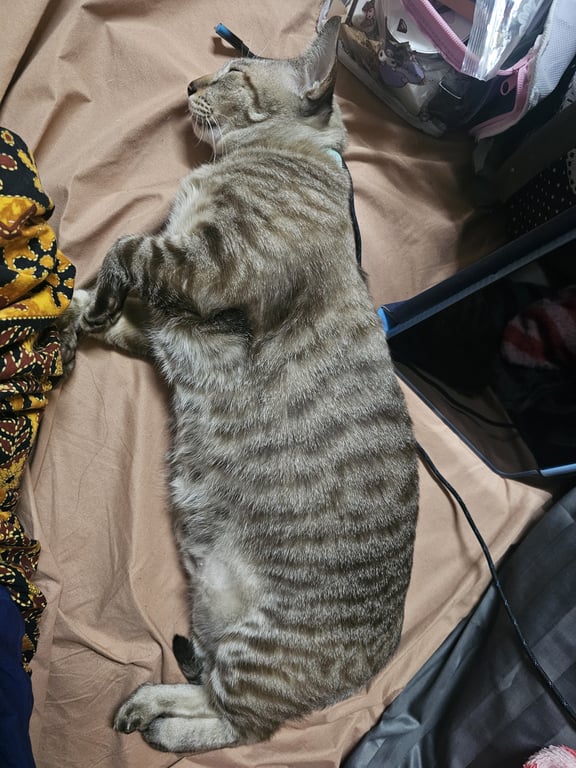 รอยตำหนิ: สีน้ำตาลลายสลิด ตาสีเขียว หูขวามีแผลเล็กน้อย ใส่ปลอกคอสีเขียวมีกระดิ่งติดคน กินเก่ง