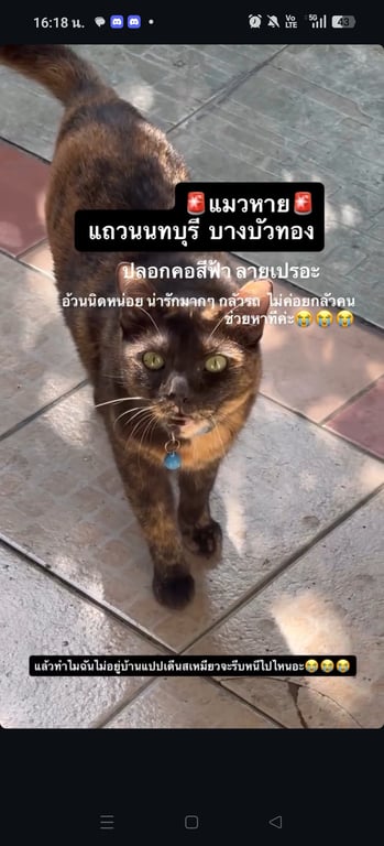 รอยตำหนิ: ปากล่างแบ่งครึ่งส้มขาว กับดำ ใส่ปลอกคอสีฟ้า กระดิ่งสีฟ้ากลัวรถ ไม่กลัวคน
