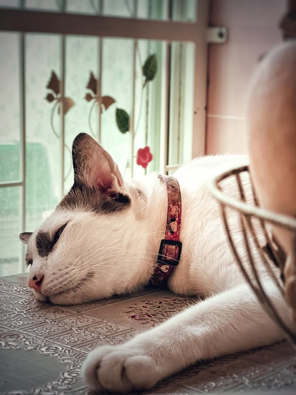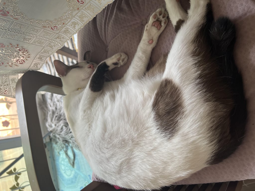 รอยตำหนิ: ขอบตาสีน้ำตาล เป็นแมวชอบร้อง หางกวักนิดๆตาสีฟ้า พูดมาก หางกุดนิดหน่อย