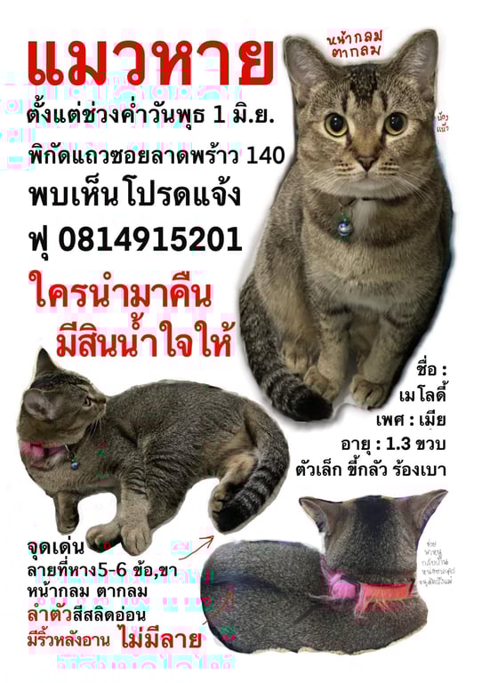 รอยตำหนิ: มีลายที่ขา 4 ข้าง ลำตัวไม่มีลาย มีริ้วหลังอาน น้ำหนักประมาณ 4 กก.