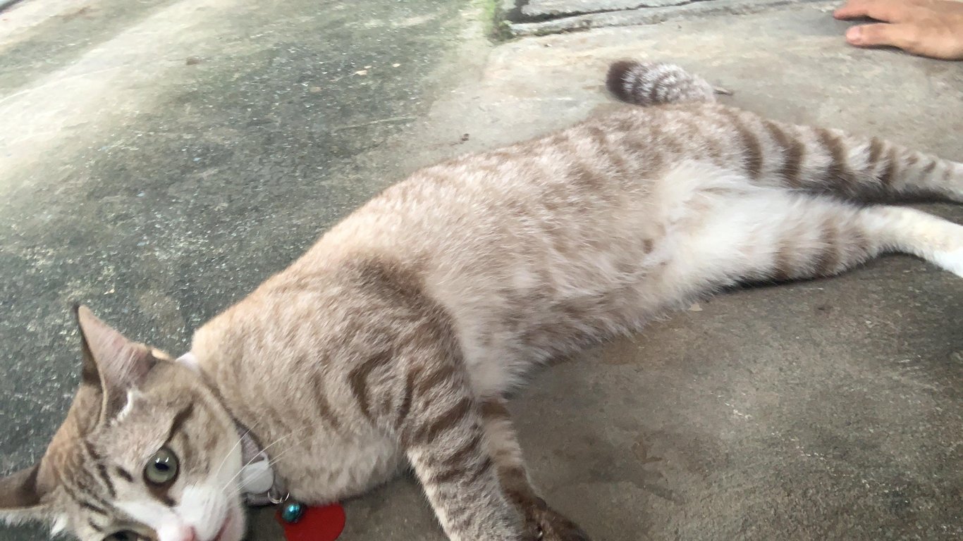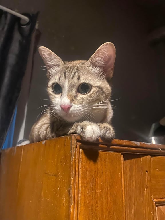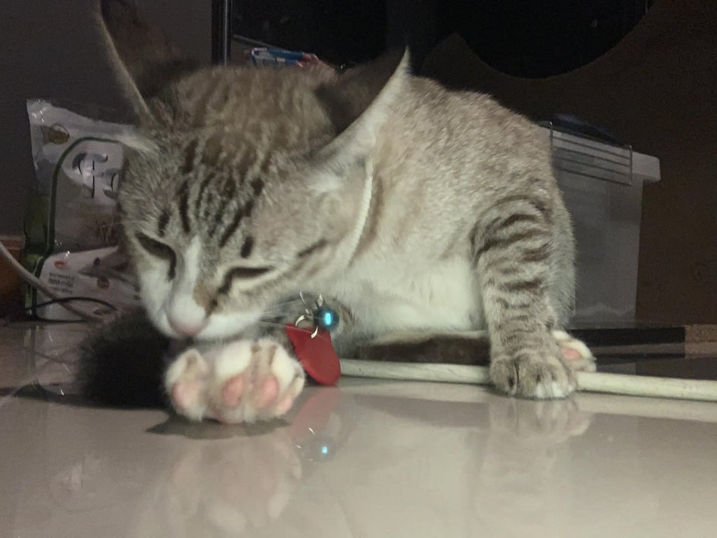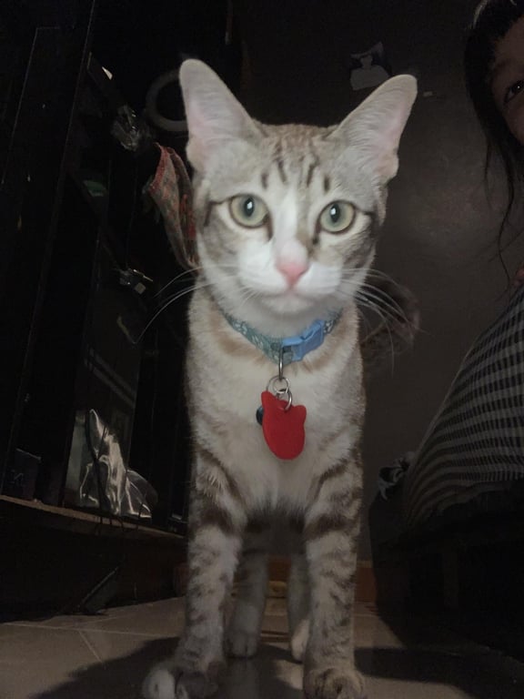 รอยตำหนิ: จมูกชมพู ตาเหลืองใส่ปลอกคอสีขาวแบบนิรภัย ไม่มีป้ายชื่อกับกระดิ่ง