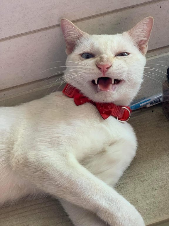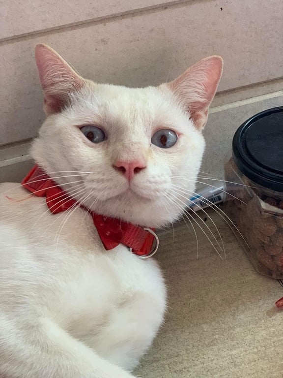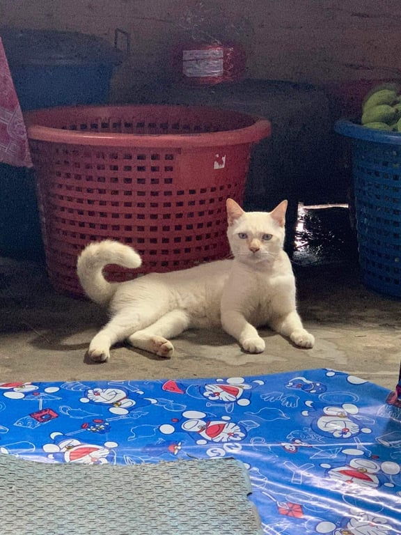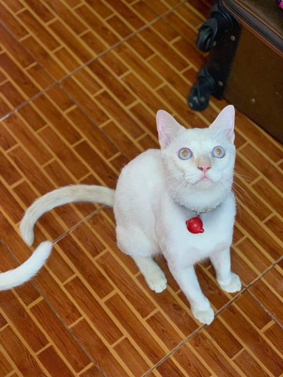 รอยตำหนิ: หน้ากลมเนื่องกรามหน้ามาครับน้องเป็นแมวที่ร้องเสียงดังลักษณะเด่นเวลากินน้ำใช้เท้าตักกินกินมีตาสีฟ้าทั้ง2ข้างหางตรงยาว
