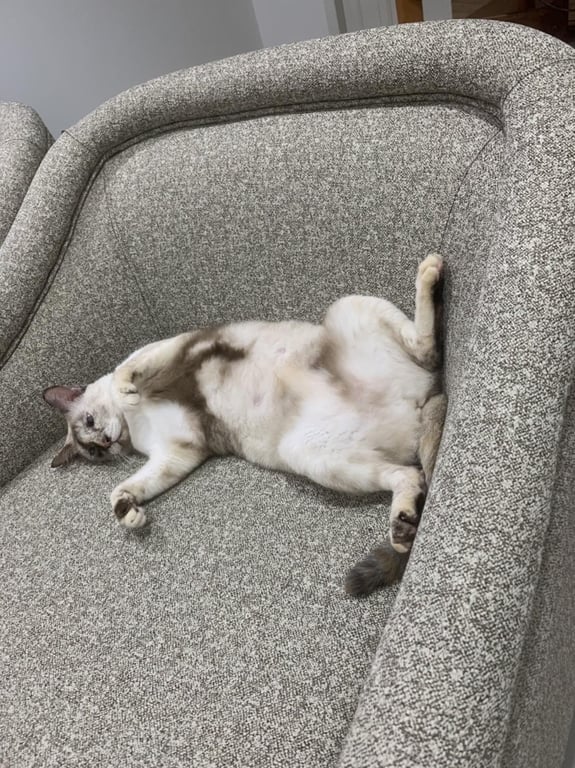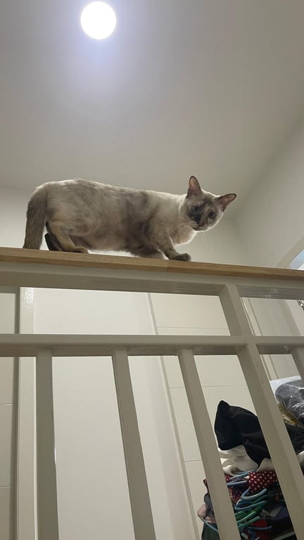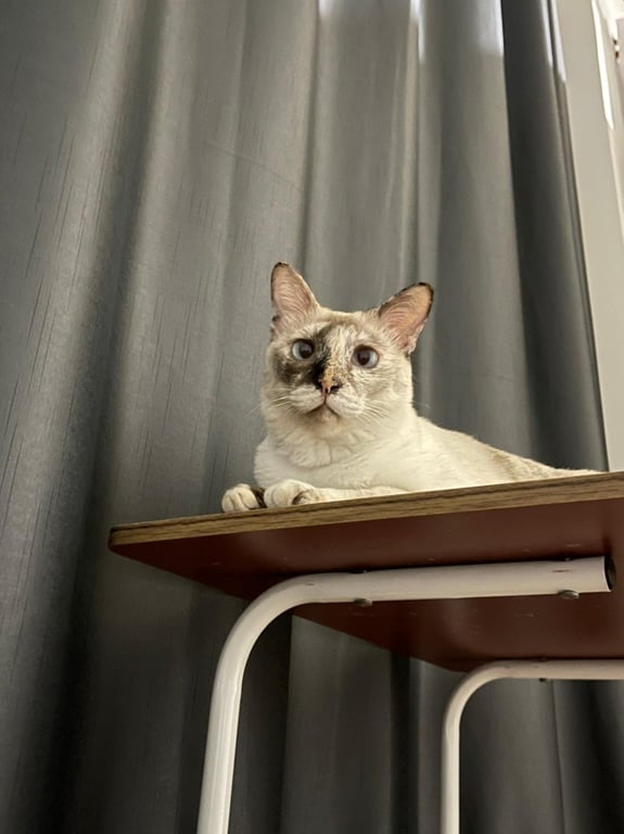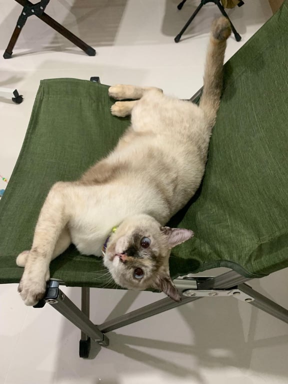 รอยตำหนิ: หน้าดำด้านขวา ตาสีฟ้าเทาๆ มองผ่านๆ จะเหมือนตาเหล่ หางมีลายแซมสีน้ำตาล ใต้ท้องช่วงขาหน้าสีน้ำตาลเข้มไม่มีปลอกคอ ท้องจะห้อยๆ มีหัวนมที่สังเกตใกล้ๆ จะเห็น
