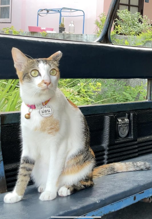 รอยตำหนิ: หางตรงยาว ขาขวามีลายสลิดสีดำพาดอยู่ส่วนล่างของขา หน้าอกมีแต้มสีเหลืองดวงใหญ่ ข้างปากมีแต้มสีเหลืองสองข้างม่อนมีนิสัยขี้กลัวคนแปลกหน้า และเสียงรถมากๆ แต่ถ้าสนิทด้วยจะขี้อ้อนและขี้เล่นมากๆ