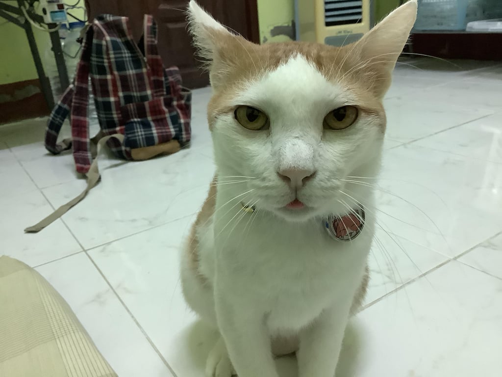 รอยตำหนิ: หางยาวตรง ตัวใหญ่กว่าแมวไทยทั่วไปนิดหน่อยแมวขาวส้มลายหน้ากาก ตัวใหญ่กว่าแมวไทยทั่วไปนิดหน่อย หนักราวห้ากิโล ใส่ปลอกคอสีเขียวมีกระดิ่งกับป้ายชื่อ นิสัยสุภาพแต่ขี้ตกใจ
