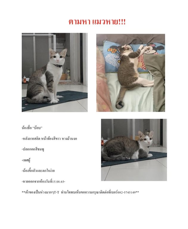 รอยตำหนิ: หางม้วนงอ กลัวคน ขี้ตกใจน้องใส่ปลอกคอสีชมพู หายไปวันที่15/08