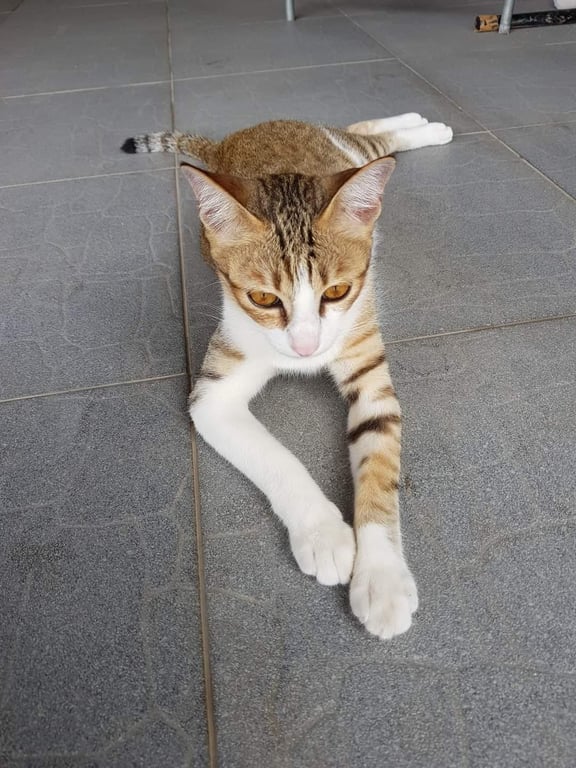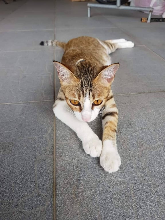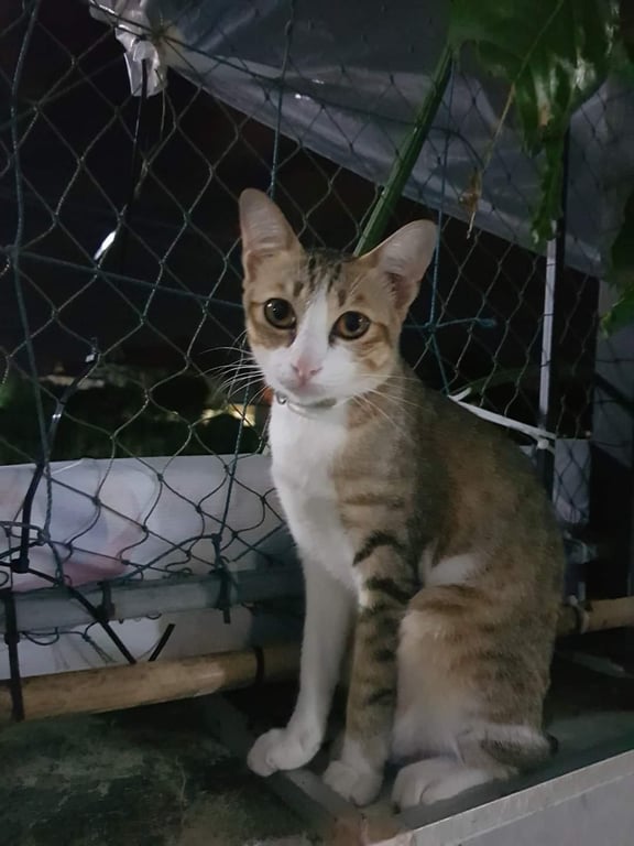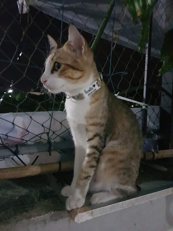 รอยตำหนิ: ปลายหางมีลายสลิดสีดำ แขนข้างซ้ ายมีลายสีน้ำตาล ตาสีเหลือง น้ำหนักประมาณ 3.5 กก.น้องมีปลอกคอที่มีชื่อและเบอร์โทร น้องจำชื่อตัวเองได้
