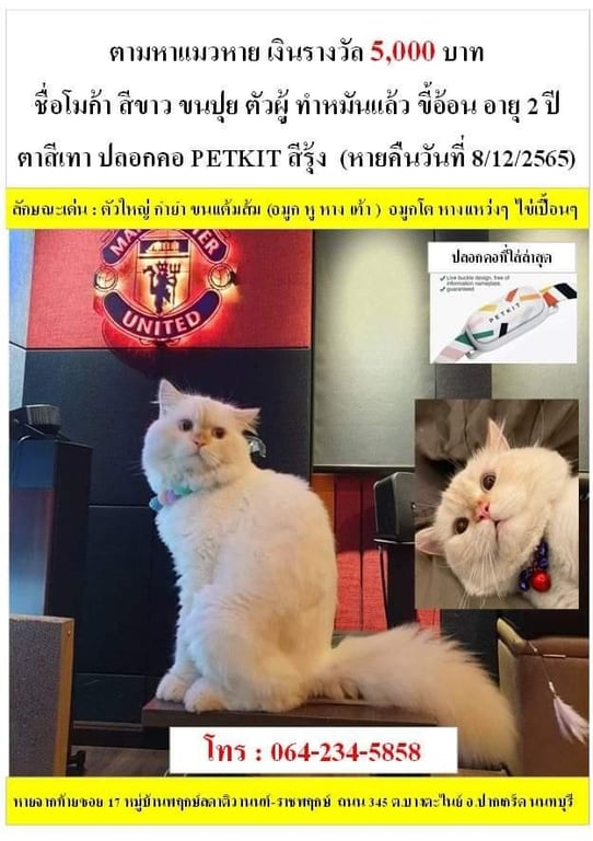 รอยตำหนิ: ขนหางแหว่ง จมูกใหญ่ หัวใหญ่ ตัวกำยำมีเงินรางวัล 5,000 บาท หายออกจากบ้านประมาน 02.00 วันที่ 8/4/2565 หมู่บ้านพฤกษ์ลดา ติวานนท์-ราชพฤกษ์ น้องหมาตะกายมุ้งลวดเข้าบ้าน มุ้งลวดขาด แมวเลยหนีเที่ยว บ้านอยู่ติดรั้วโครงการ น่าจะปีนรั้วโครงการออกไปนอกหมู่บ้าน
