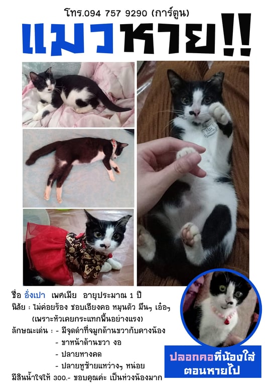รอยตำหนิ: ขาหน้าด้านซ้ายผิดรูป ปลายหางงอ ปลายหูด้านซ้ายแมวเป็นแผลๆน้องมีนิสัยไม่ค่อยร้อง จะเอ๋อๆ มึนๆ เดินหมุน เอียงคอบ่อยๆ ไม่ค่อยเต็มเพราะหัวกระแทกอย่างแรงตอนรถชน