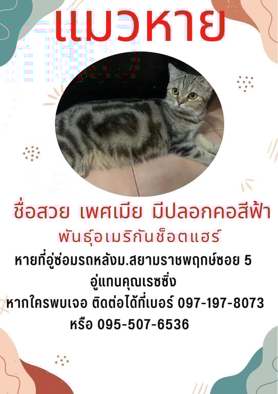รอยตำหนิ: มีปลอกคอสีฟ้า ลายดอกไม้ขี้กลัว ถ้าได้เลี้ยงไปซักพักจะอ้อนมาก