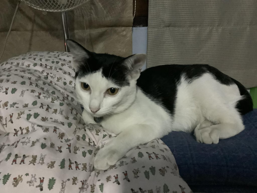 รอยตำหนิ: มีรอยแผลทำหมันที่ท้อง /หางสีดำล้วนตากลมโตสีเหลือง ขีดสีดำ หนวดและคิ้วสีขาว จมูกแดง ช่วงตัวมีสีดำเยอะ แต่ช่วงท้องเป็นสีขาวล้วน ใส่ปลอกคอสีชมพู เป็นแมวเด็ก ขี้อ้อน ติดคน กินเก่ง ช่วงเช้าชอบเล่นซน ช่วงบ่ายชอบนอน ตัวและขนเค้าจะนุ่มนิ่มมาก หูข้างซ้ายมีสีขาวปน หูข้างขวาเป็นสีดำล้วน