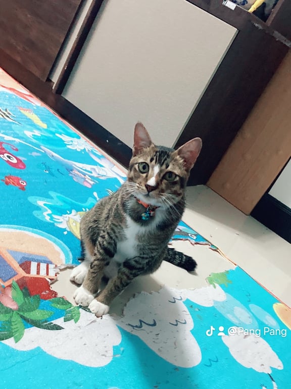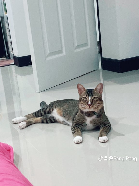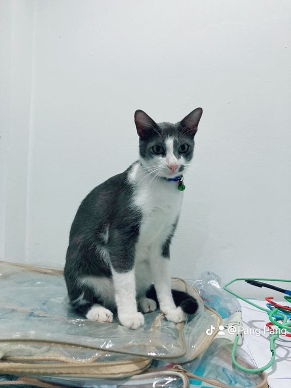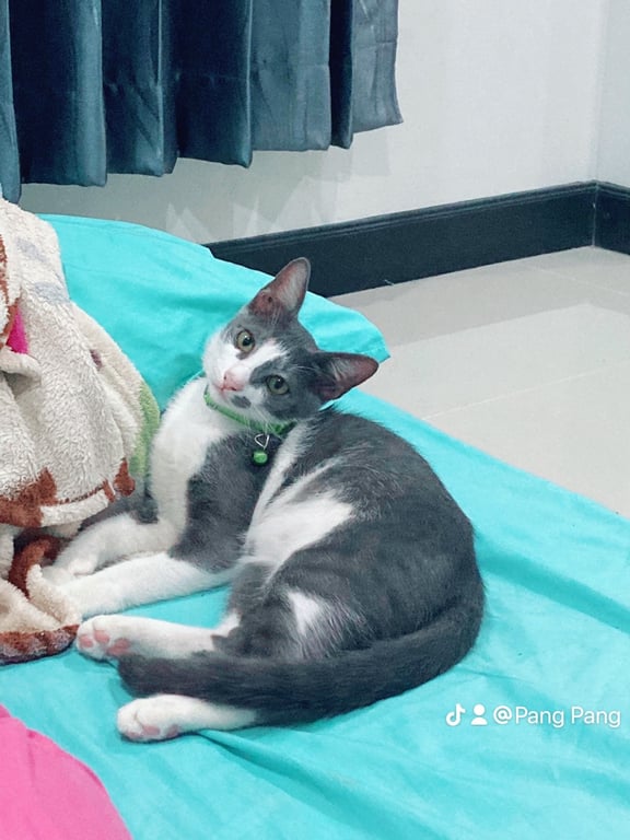 รอยตำหนิ: สีขาวเทา มีปานแก้มด้านซ้ายสีเทา ขาว เงียบๆ ลายสลิดขี้อ้อน จับให้อุ้ม