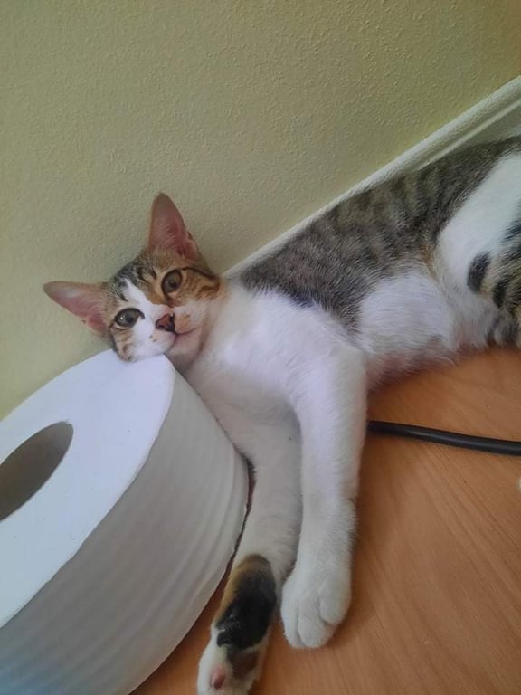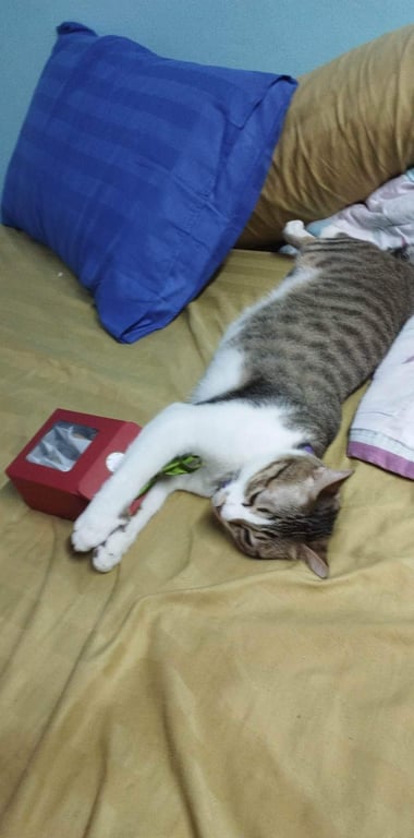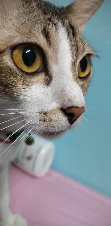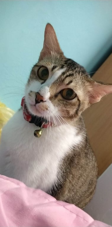 รอยตำหนิ: หางกวัก ปลอกคอสีเหลืองไม่มีกระดิ่งน้องขี้กลัวคน กลัวรถ แต่เก่งกับแมวด้วยกัน ชอบกินแมวเลีย ถ้ามีคนทำปากจุ้บๆทน้องจะเดินไปจุ้บปาก