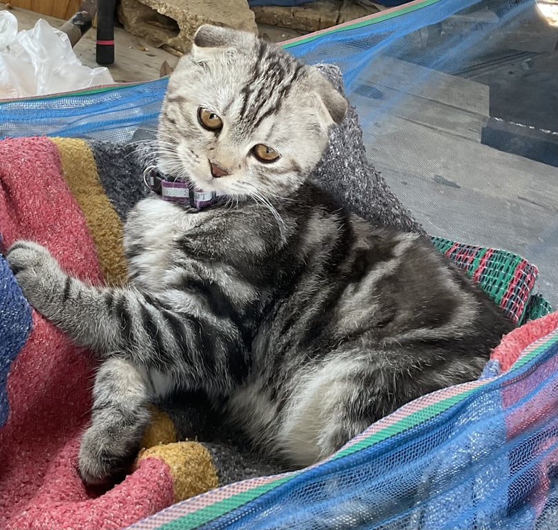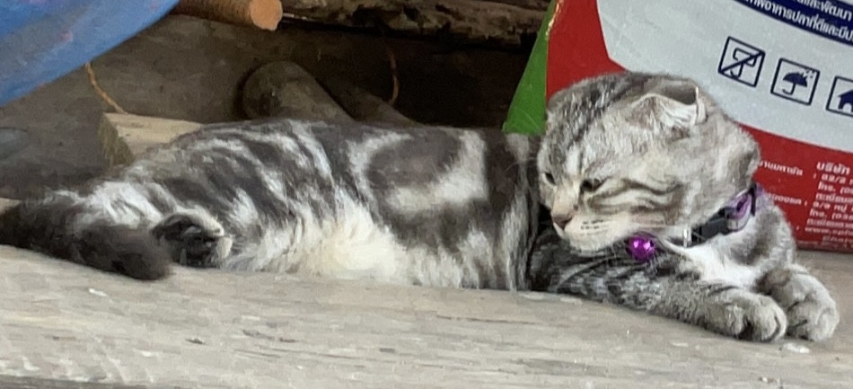 รอยตำหนิ: หาวยาวมากๆมีปอกคอสีม่วงสะท้อนแสงเป็นแมวขี้กลัว ไม่ค่อยให้จับ