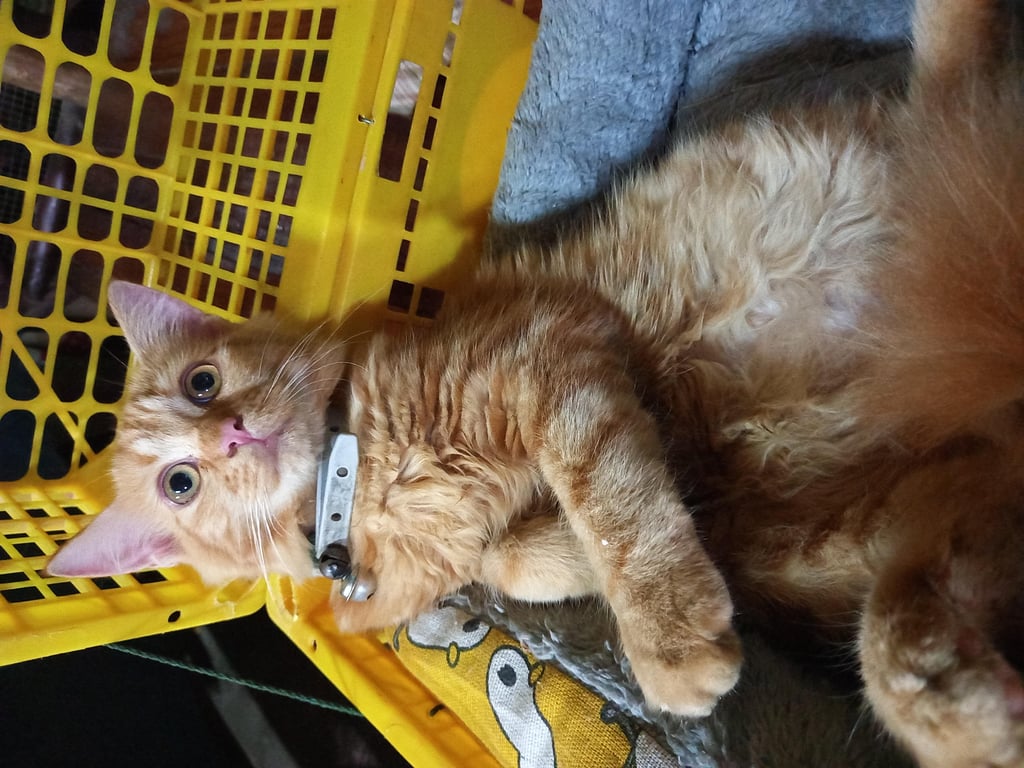 รอยตำหนิ: น้ำหนัก2.7โล มีแผลที่ขาหลังด้านในใส่ปลอกคอสีเทา กระดิ่ง2อัน ตัวสีส้ม ตาสีเหลือง อายุ6เดือน กลัวคนแปลกหน้า ข้ามถนนไม่เป็น