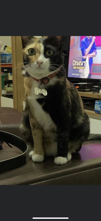 รอยตำหนิ: มีแสกหน้าสามสีกลางหน้า พุงห้อย รู้จักชื่อตัวเองรู้จักชื่อตัวเอง ไม่กินอาหารคน กินแค่อาหารเม็ดกับอาหารซอง หวั่นไหวกับเสียงเทอาหารมาก เชื่อง ตัวไม่ใหญ่แต่พุงห้อย น้ำหนัก 4 กิโลกรัม