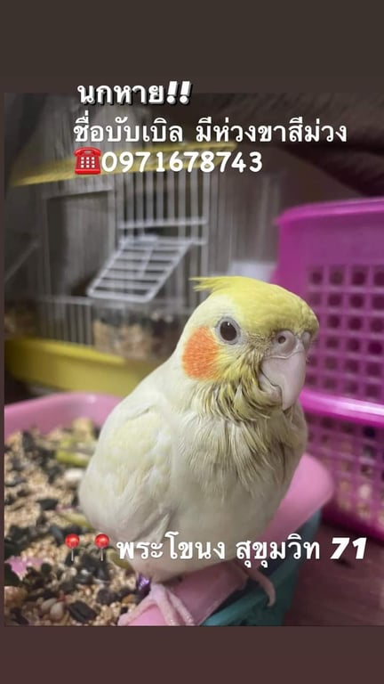 ไม่มีจุดสังเกตุ แต่มีห่วงข้อเท้าสีม่วง มีเบอร์โทรศัพท์0971678743 และเขียนขื่อว่าบับเบิ้ล ตัวเหลืองแก้มส้ม