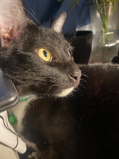 น้องมีปลอกคอสีเขียวเท้าทั้งข้างเป็นสีขาวตาเป็นสีเหลืองสังเกตตรงใต้ค่ะจะเป็นสีขาวใต้ท้องเป็นสีขาวนิสัยน้องเป็นคนกลัวเสี่ยงรถยนต์แล้วก็ถ้าน้องเจอคนที่รักแมวน้องจะอ้อนแต่น้องเป็นคนขี้กลัว
