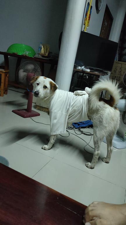 ขนฟู สีขาวลายน้ำตาล ตรงตาแฉะข้างนึง ตัวผอมๆ