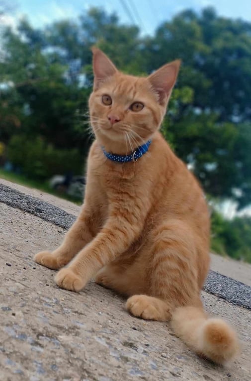เป็นแมวสีส้มหางยาวตัวผู้อายุประมาณ 6 - 7 เดือนตัวค่อนข้างใหญ่ ตาสีส้ม สวมปลอกคอแมวนิรภัยสีน้ำเงินลายจุด ชอบเล่นไม้ตกแมวมาก ขนค่อขนข้างเยอะและนิ่ม ร้อนง่าย
