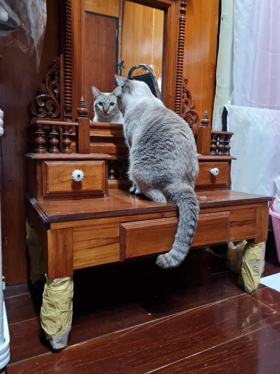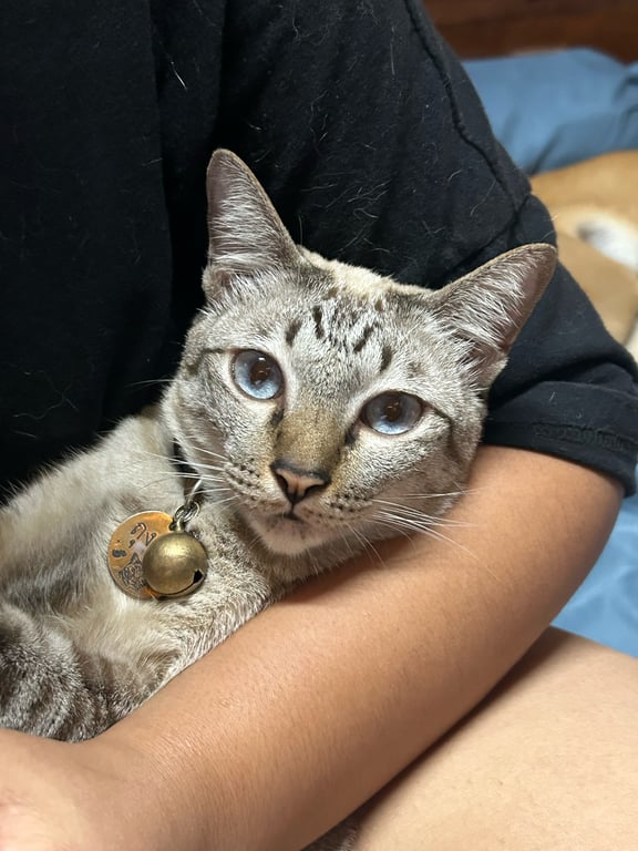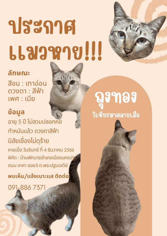 อายุ 4 ปี น้ำหนักประมาณ 6 กิโลกรัม หางยาว ตาสีฟ้า กลมโต ไม่สวมปลอกคอ ขนสีขาวที่เเผงคอ ลายที่หลังมีสีเทาสลับดำ มีลายMที่หน้าผากชัดเจน จมูกสีน้ำตาล นิสัยขี้อ้อน ช่างพูด