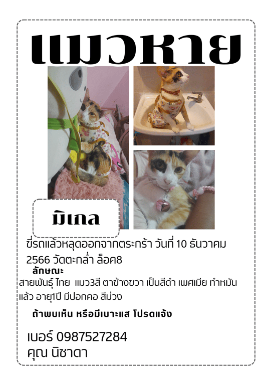 น้องหลุดออกจากตะกร้า ที่วัดตะกล่ำ ล็อค8 ไม่ใช่แถวบ้านน้อง ไกลจากบ้านน้องพอสมควร น้องทำหมันแล้ว ขี้กลัวแต่ไม่กัด ใครเจอแล้วทีเบอร์ 0987527284