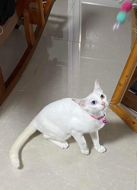 รอยตำหนิ: ตาสองสี /สีขาว/ตัวเล็กใส่ปลอกคอสีชมพู