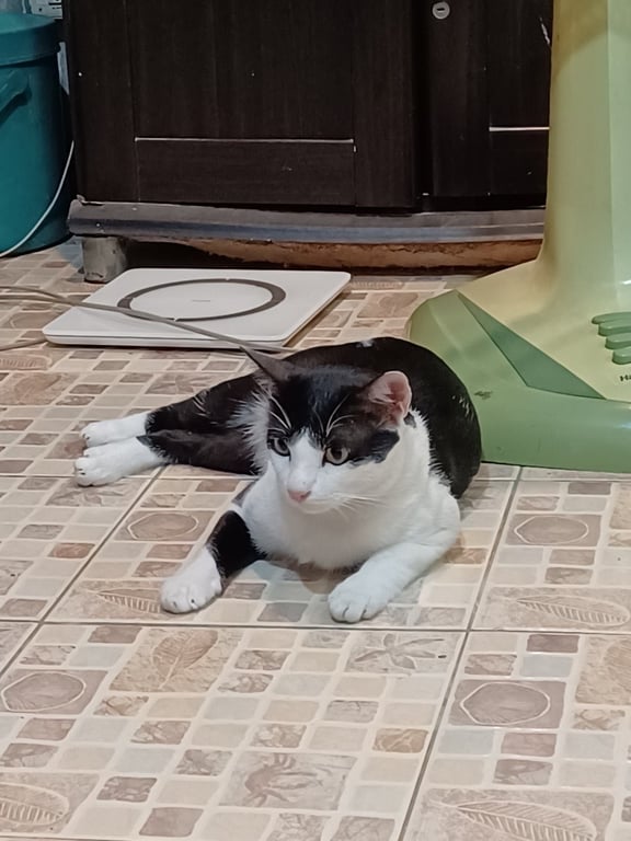 รอยตำหนิ: ขาซ้ายขาว ขาขวาสีดำมีรอยแบ่งตรงกลาง หลังดำ หน้าแสกกลางไม่มีปอกคอ เสียงร้องออกหง่าวๆ เข้มๆ ท่าทางขี้ระแวง
