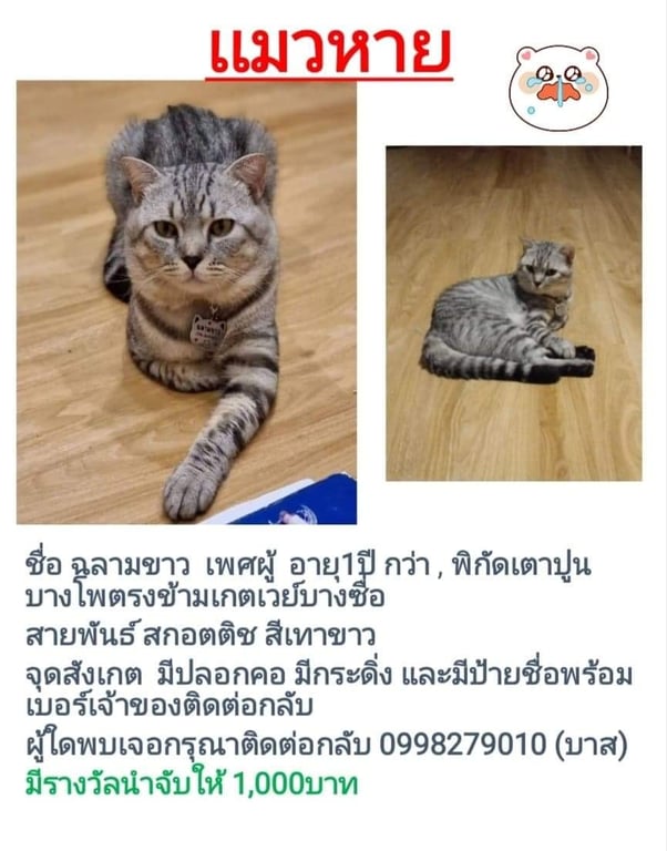 รอยตำหนิ: ทีคอมีปลอกคอ มีทั้งขื่อและเบอร์โทรแมวชื่อฉลามขาว ลานสลิดสีเทาดำ หัวกลมหูไม่ยาวมากในตาสีเหลิองมีวงรอบดวงตาสีดำ ขอบตามีลายดำเหมือนทาอายชาโด้ ปลายหางมีขนสีดำ มีปลอกคอ มีชื่อและเบอร์โทรเจ้าของ