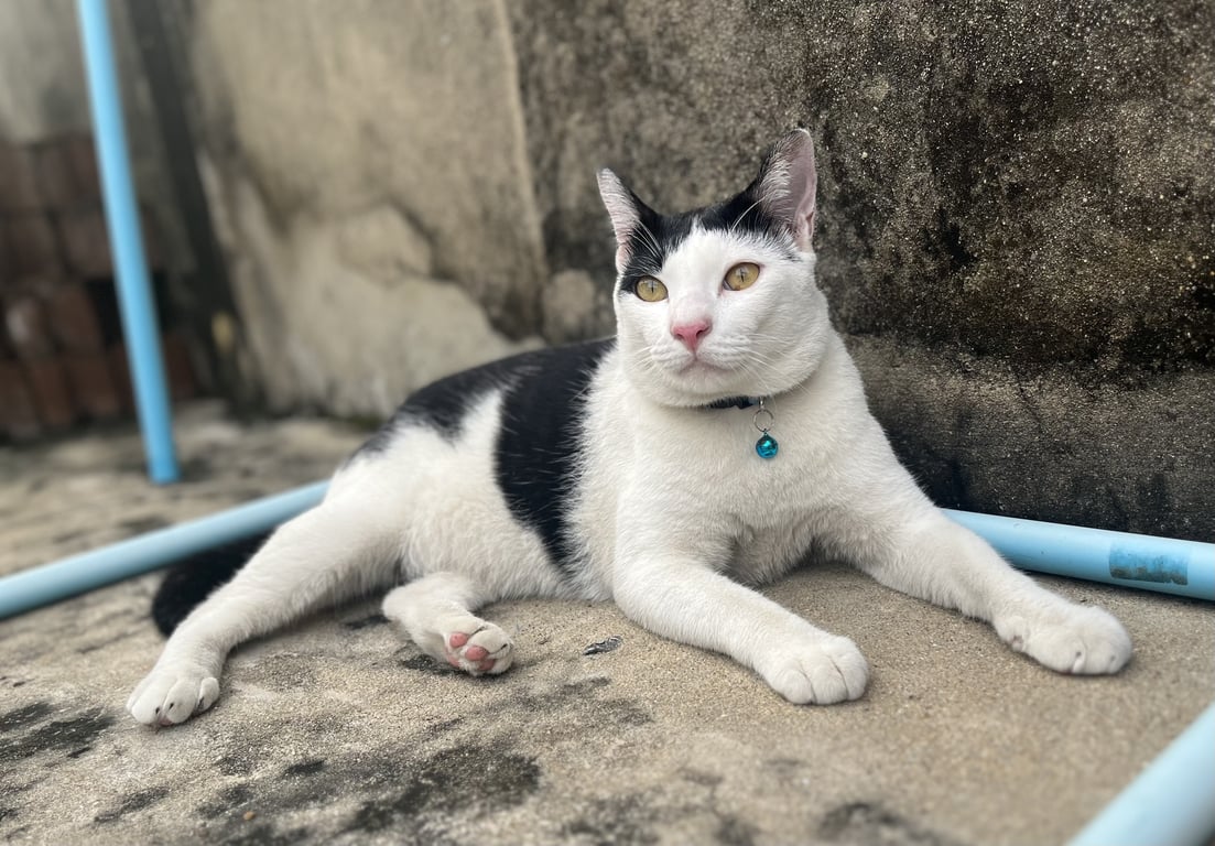 รอยตำหนิ: มีหน้าม้าปัดมาถึงหางตาขวา ขาขาวล้วนทั้ง 4 ขา ท้องขาวล้วน หางดำล้วนมีงอปลาย น้ำหนัก 7 กิิโลกรัมนิสัยเป็นแมวไม่ค่อยกลัวคน แต่กลัวเสียงรถเป็นอย่างมาก มีรูปร่างอวบ ใส่ปลอกคอสีฟ้าแถบเงินสะท้อนแสง กระดิ่งฟ้า