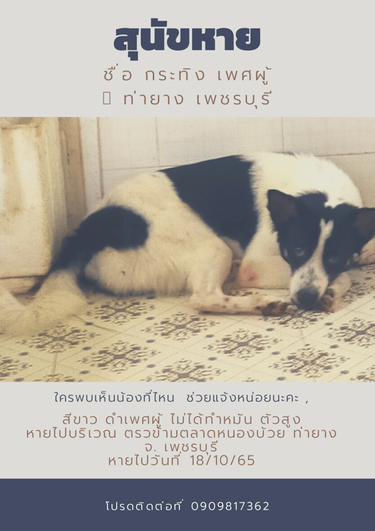รอยตำหนิ: ตัวสูง ไม่อ้วนยังไม่ได้ทำหมัน ไม่ดู ไม่กัด