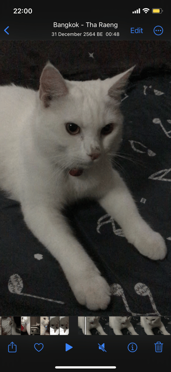 รอยตำหนิ: ตาสีเหลือง มีรอยดำตรงจมูก(เช็ดไม่ออก) ไม่ใส่ปลอกคอเป็นแมวพันธุ์ผสมสีขาวล้วน ตาสีเหลือง คนฟูแต่ไม่ยาวมาก ไม่ได้ใส่ปลอกคอ ค่อนข้างตื่นคน